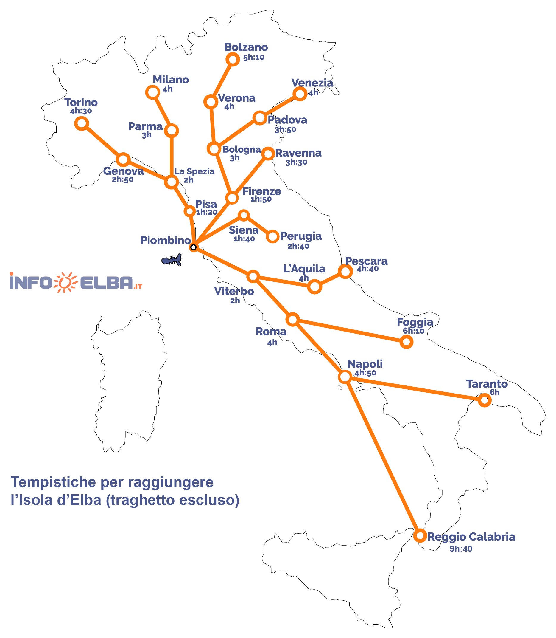Da Torino prendere l’autostrada A21 direzione Alessandria, prendere l’uscita per la A26 “Alessandria sud” direzione Genova. Continuare sulla A10 direzione “Genova/Livorno”, quindi prendere l’uscita A12 verso “Genova Est/Livorno”. Proseguire fino a Rosignano Marittimo, quindi uscire e prendere la SS1 – Via Aurelia direzione Grosseto, uscire a “Venturina – Isola d’Elba” e proseguire per Piombino Marittima /Imbarchi.